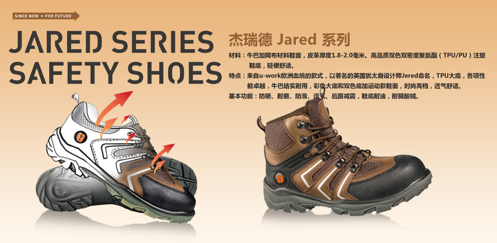 材料:牛巴加网布材料鞋面,皮革厚度1.8-2.0毫米。双色双密度聚氨脂(TPU/PU)注塑鞋底,轻便舒适。 特点:来自u-work欧洲的款式,TPU大底,牛巴结实耐用,彩色大底和双色底加运动款鞋面,透气舒适。 基本功能:防砸、耐磨、防滑、透气、后跟缓冲,鞋底耐油,耐弱酸碱。