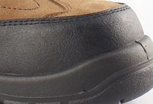 材料:淡棕色绒面皮鞋面。双密度聚氨脂(PU/PU)注塑鞋底,轻便舒适。