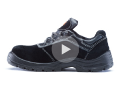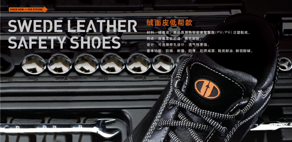 材料:绒面皮。双色双密度聚氨脂(PU/PU)注塑鞋底。 特点:皮面柔软舒适,黑色耐脏,可选择带孔透气。 基本功能:防砸、耐磨、防滑、后跟缓冲,鞋底耐油,耐弱酸碱。