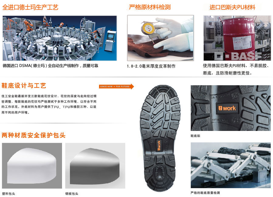 材料:绒面皮。双色双密度聚氨脂(PU/PU)注塑鞋底。 特点:皮面柔软舒适,黑色耐脏,鞋面带孔透气性更强。 基本功能:防砸、耐磨、防滑、后跟缓冲,鞋底耐油,耐弱酸碱。 |